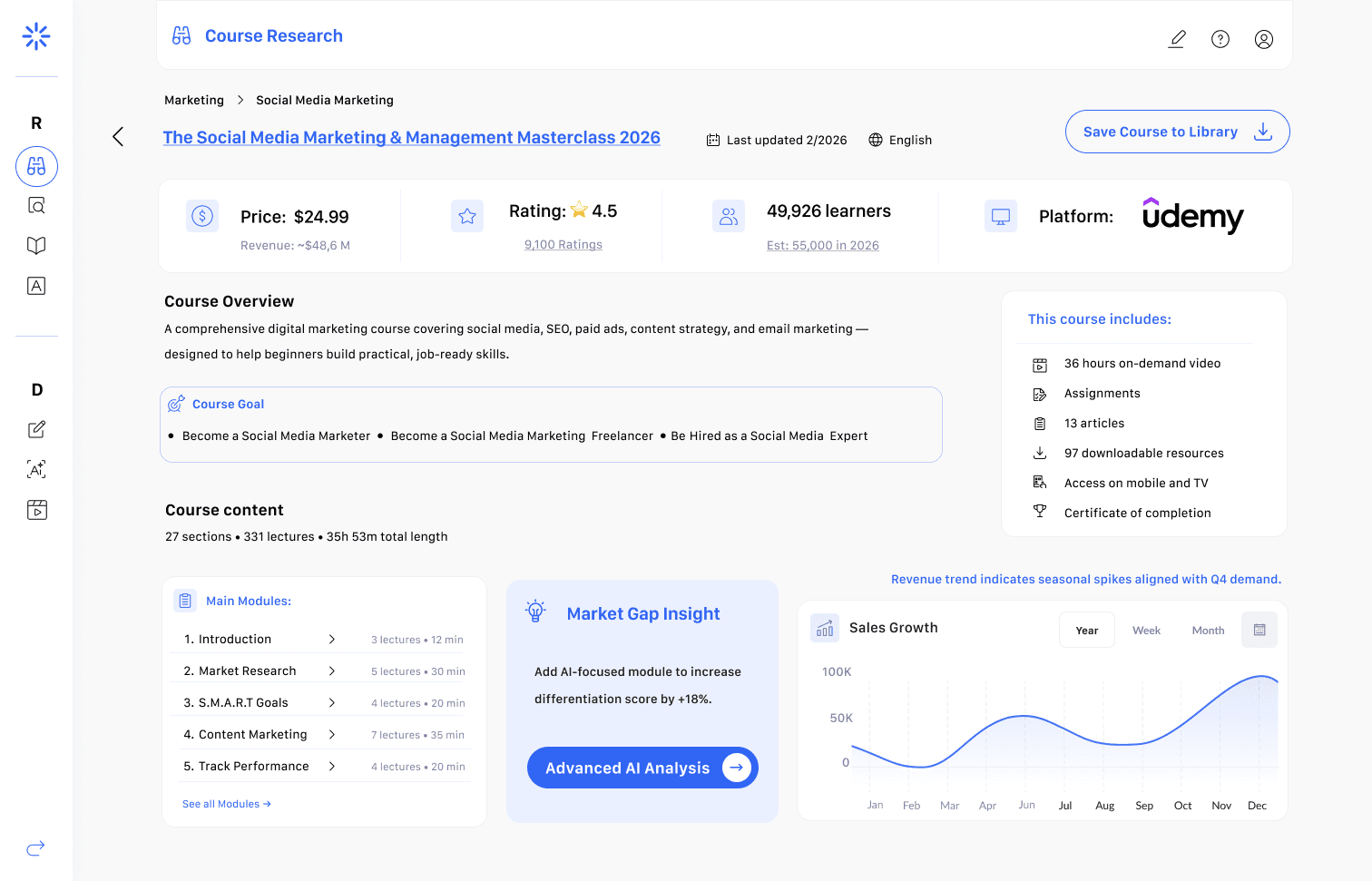 After reviewing the dashboard analysis and competitor table, users can navigate to an individual course page for a more detailed evaluation.