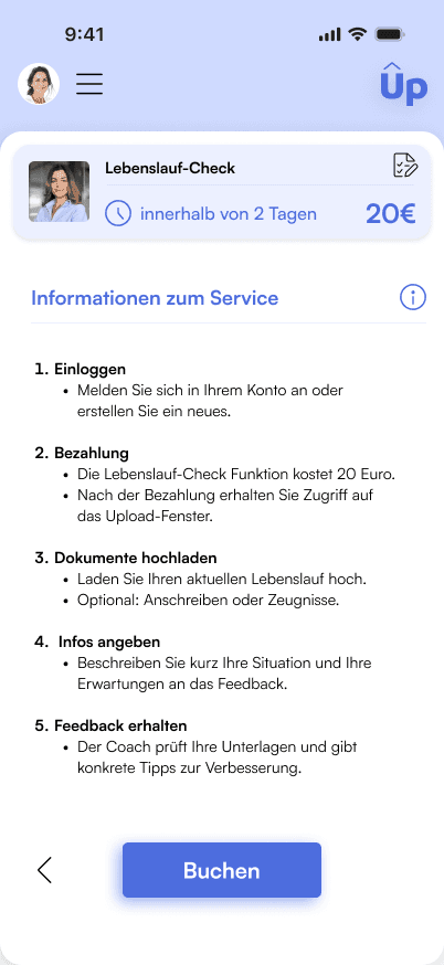 User searches for suitable coach, selects the “CV Check” service. The user then completes the payment and uploads their CV and related documents for review. The coach reviews the documents and sends personalized feedback to the user via chat.