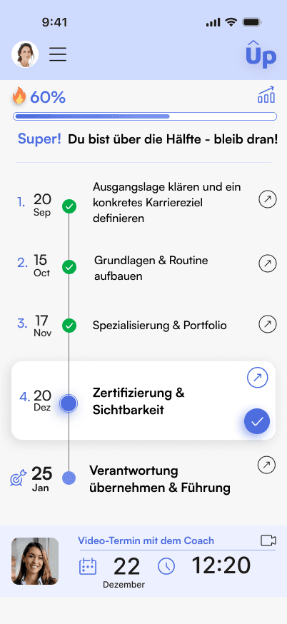 After the session, the coach creates a structured career plan, which the user can view on their dashboard and follow over time.
