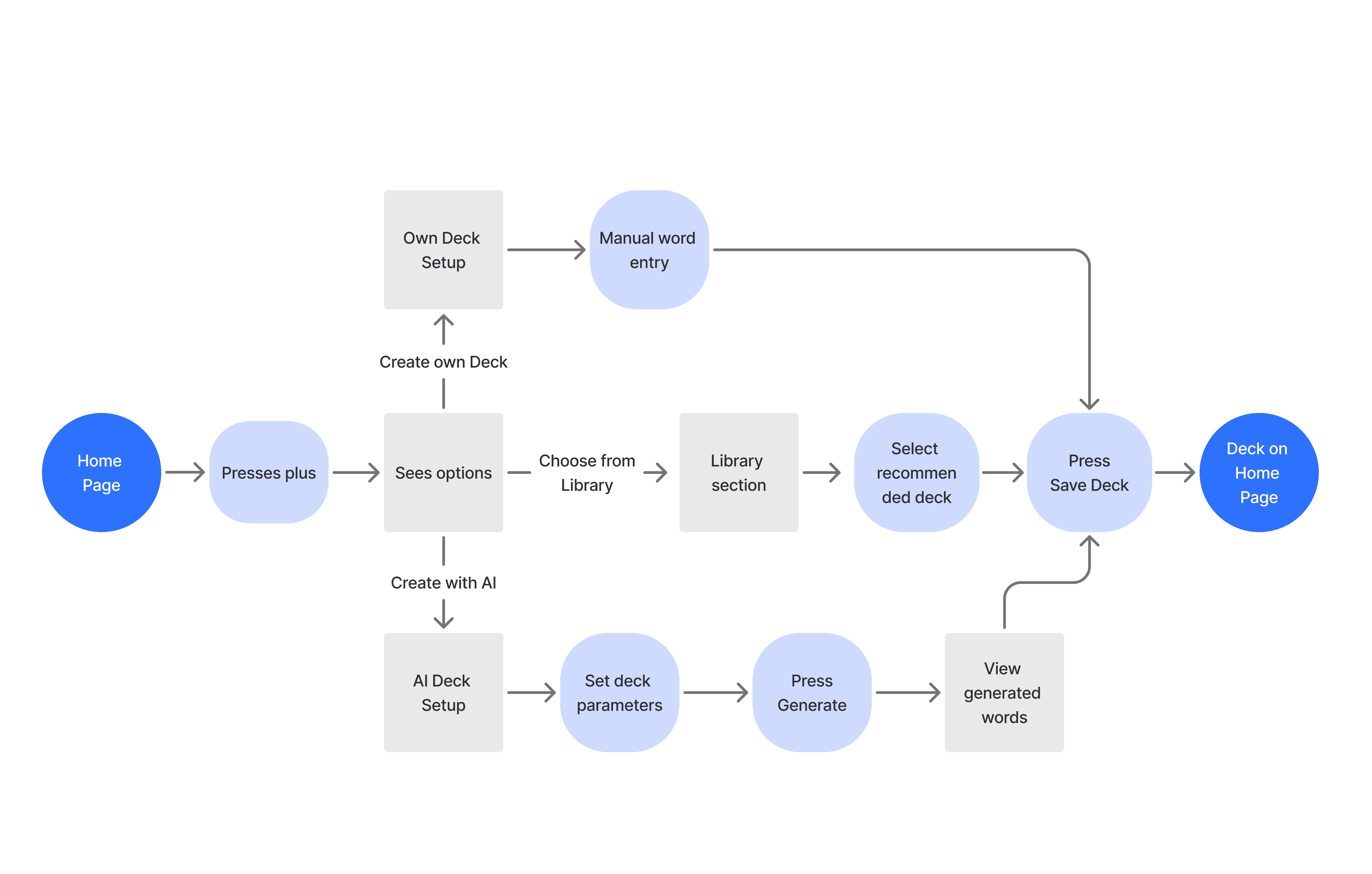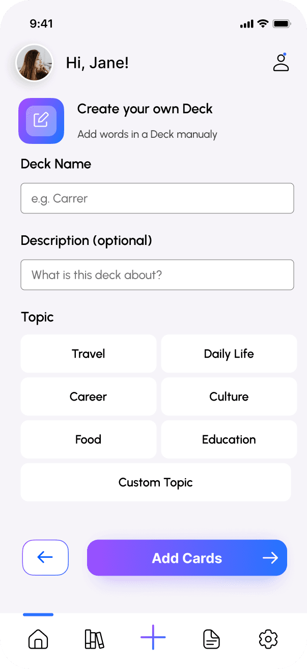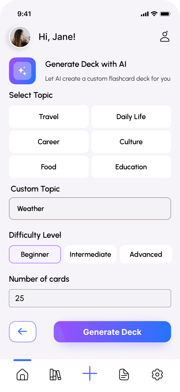 Allow users to quickly create their own flashcard decks or generate topic-based decks using AI.