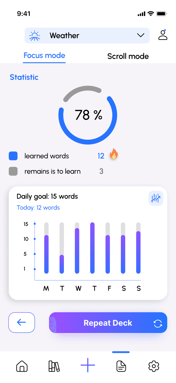 In Focus Mode, users learn words using classic flashcards. After completing a session, they can see clear statistics showing how many words they have studied and reviewed.
