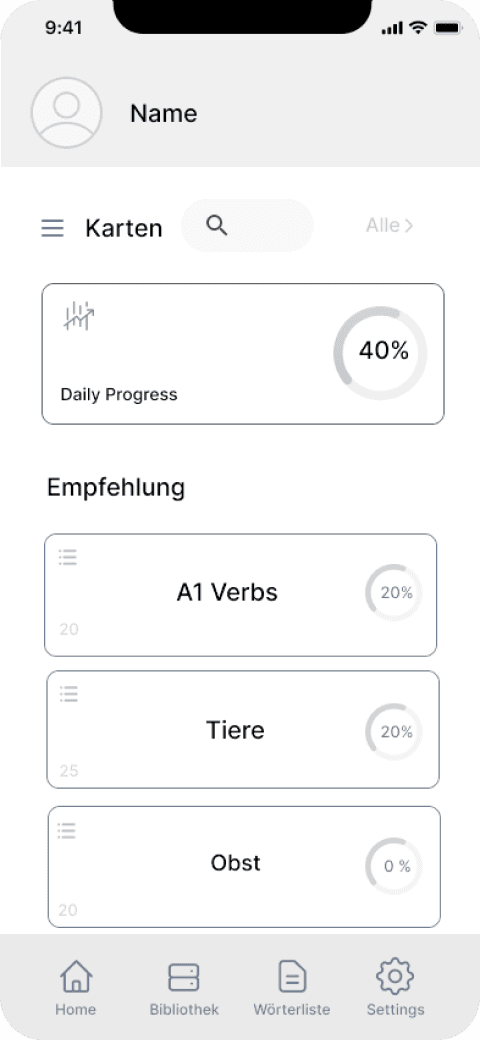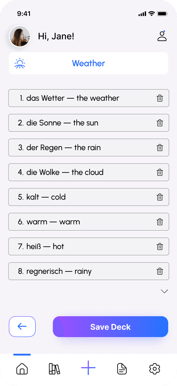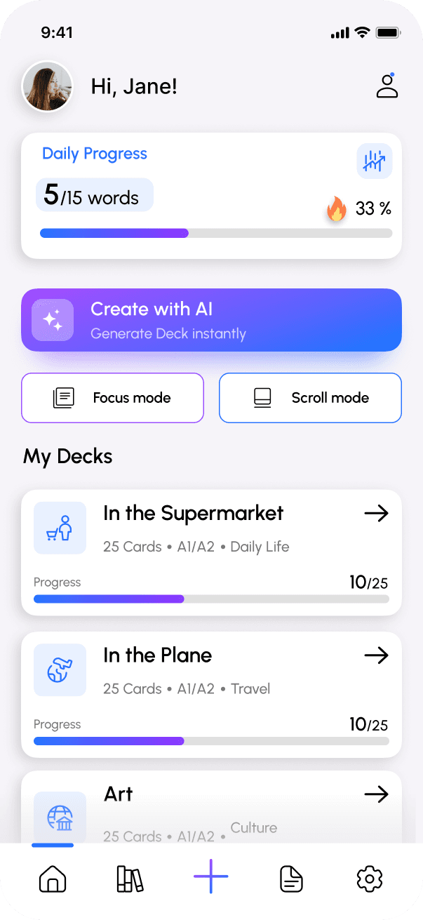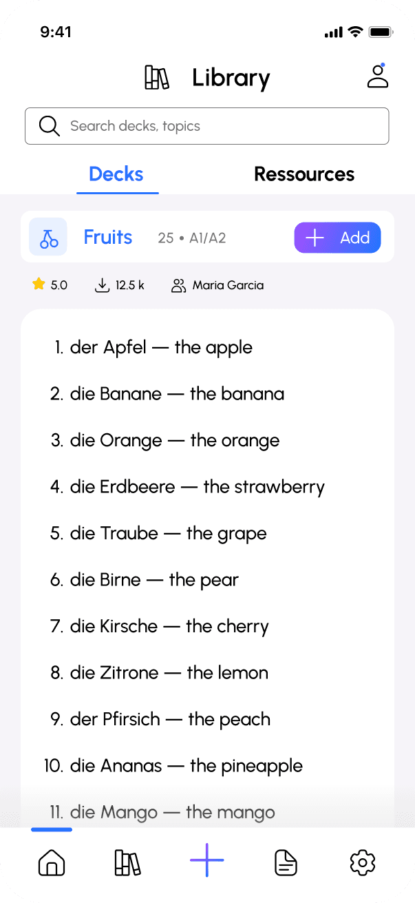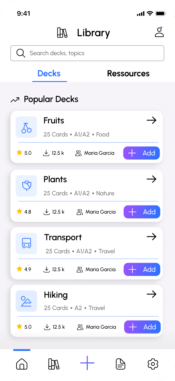 Personalized deck recommendations after onboarding ensure that content matches the user’s level, goals, and interests.