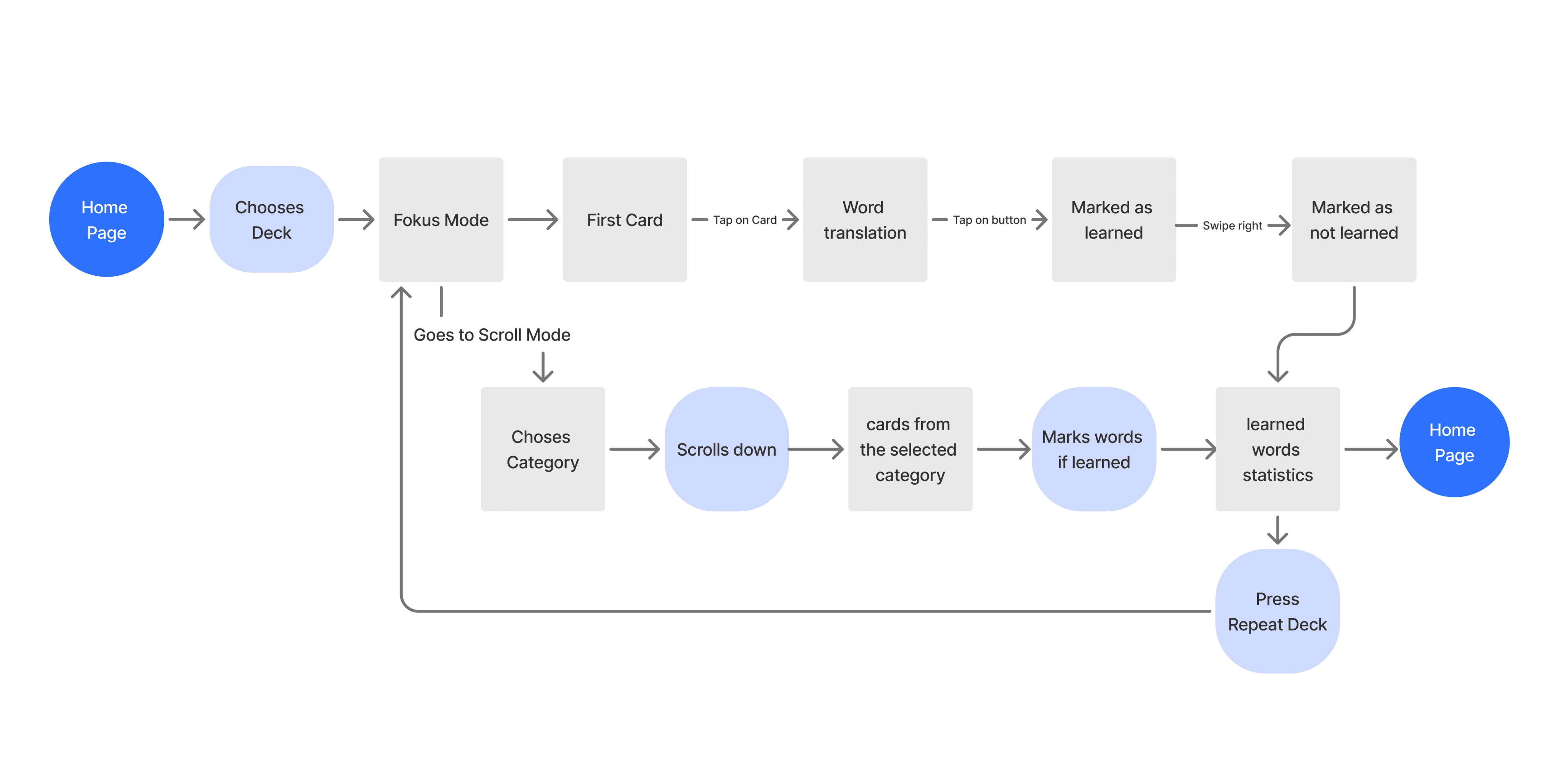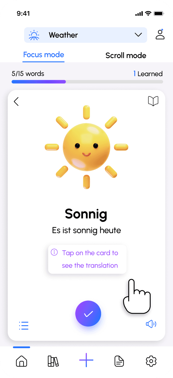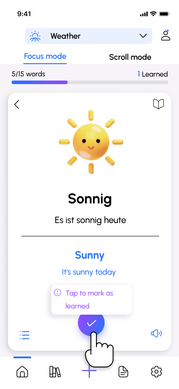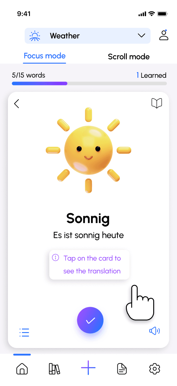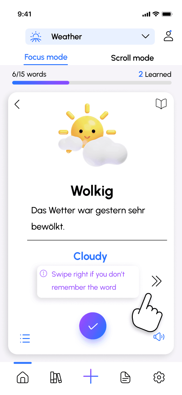 In Scroll Mode, users learn by scrolling through content where words appear in different contexts, such as short texts or dialogues, video or tests. They can filter the content (for example, only dialogues or only texts), mark words as learned during the session, and view learning statistics at the end as well.