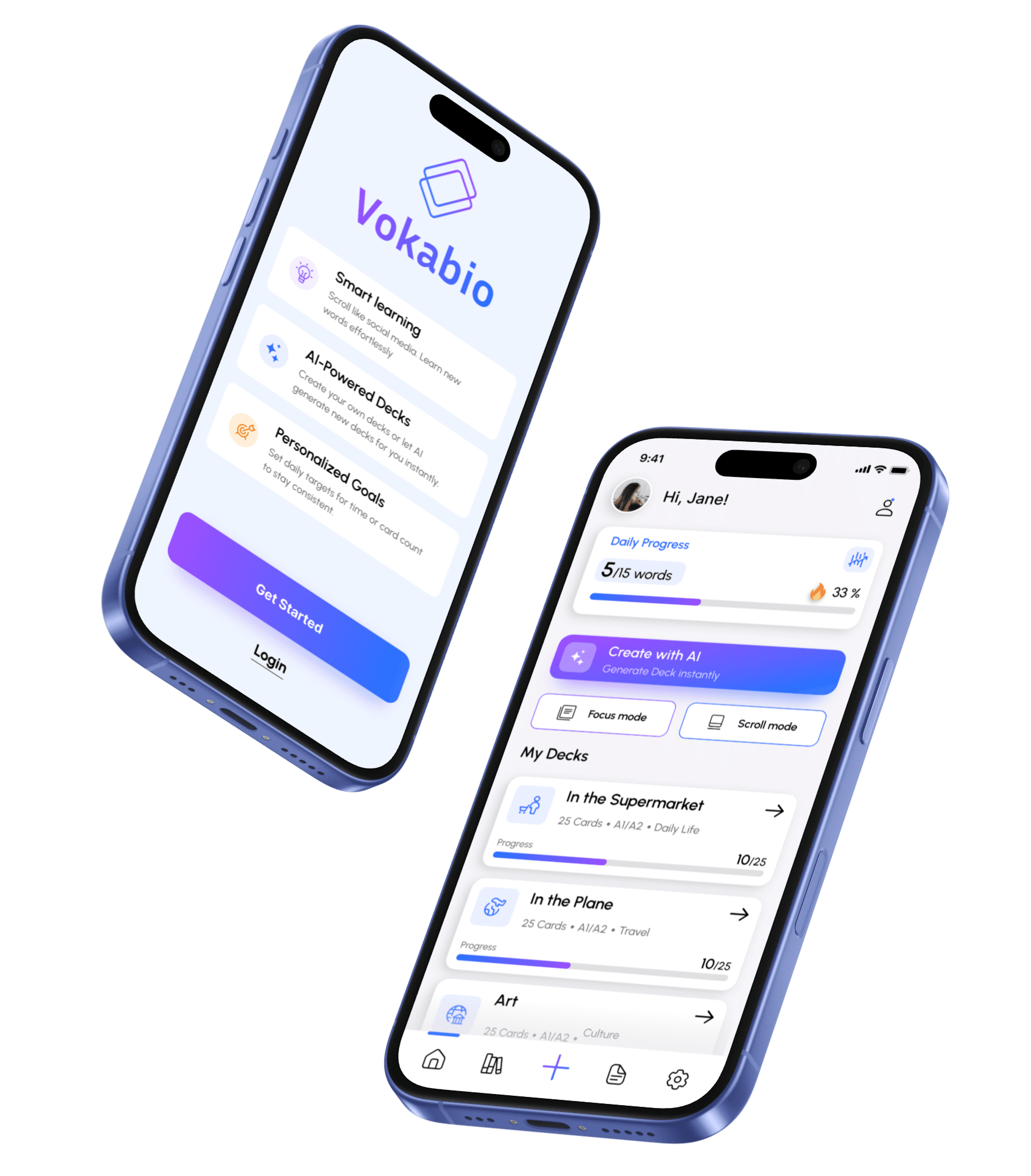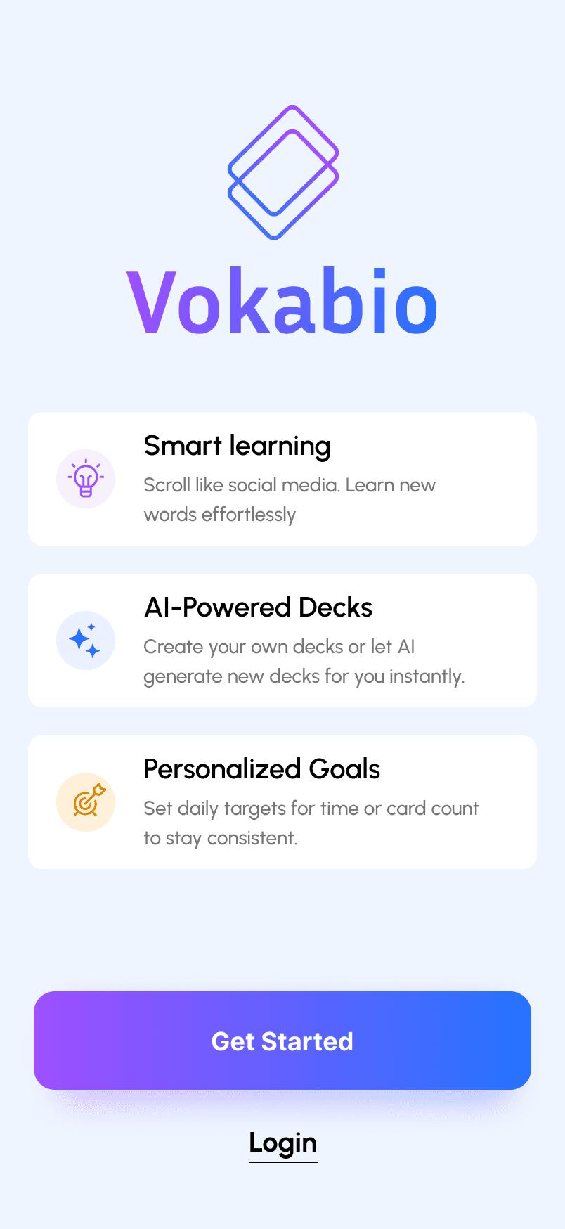 Vokabio is a vocabulary learning app that helps users learn new words through flashcards, enhanced with AI-generated decks and a scroll-based learning mode.